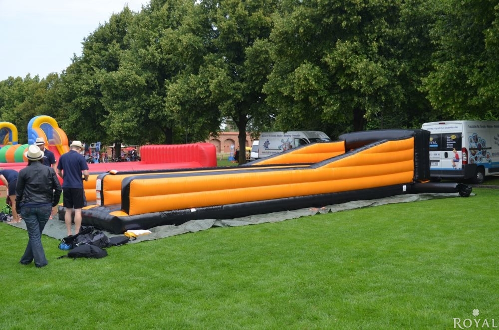 Action ist hier angesagt. Wer hat die meiste Kraft und Technik? Wer kann bei diesem Wettbewerb sein Klettkissen am Weitesten vorn platzieren? Der absolute Kraftmesser. 2 Kandidaten, welche mit Bungee Seil angegurtet sind, rennen gegen einander, aber das ist noch nicht alles, die Kraft die sie durch Ihre Rennen aufbauen, zieht sie durch das Bungee Seil zurück und lässt sie ungefährlich zu Boden fallen.