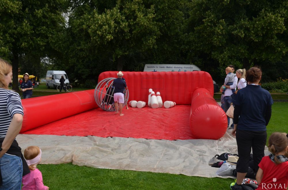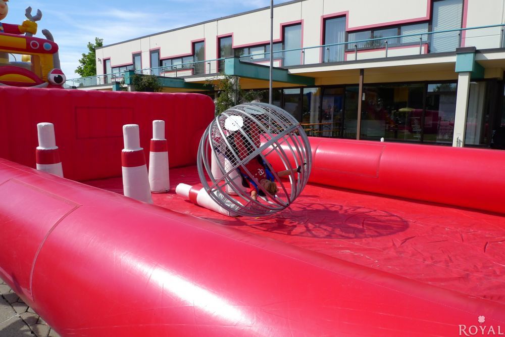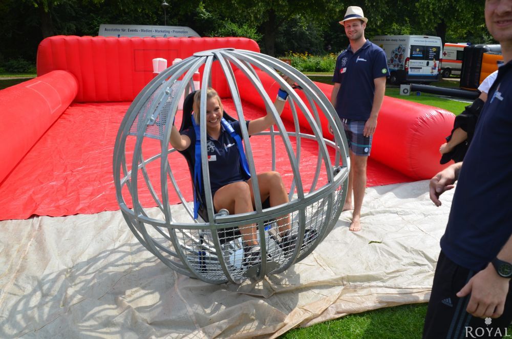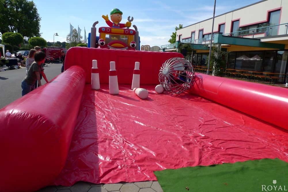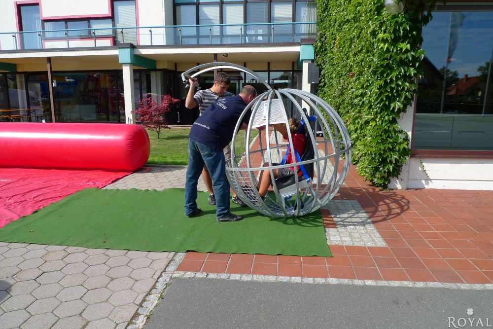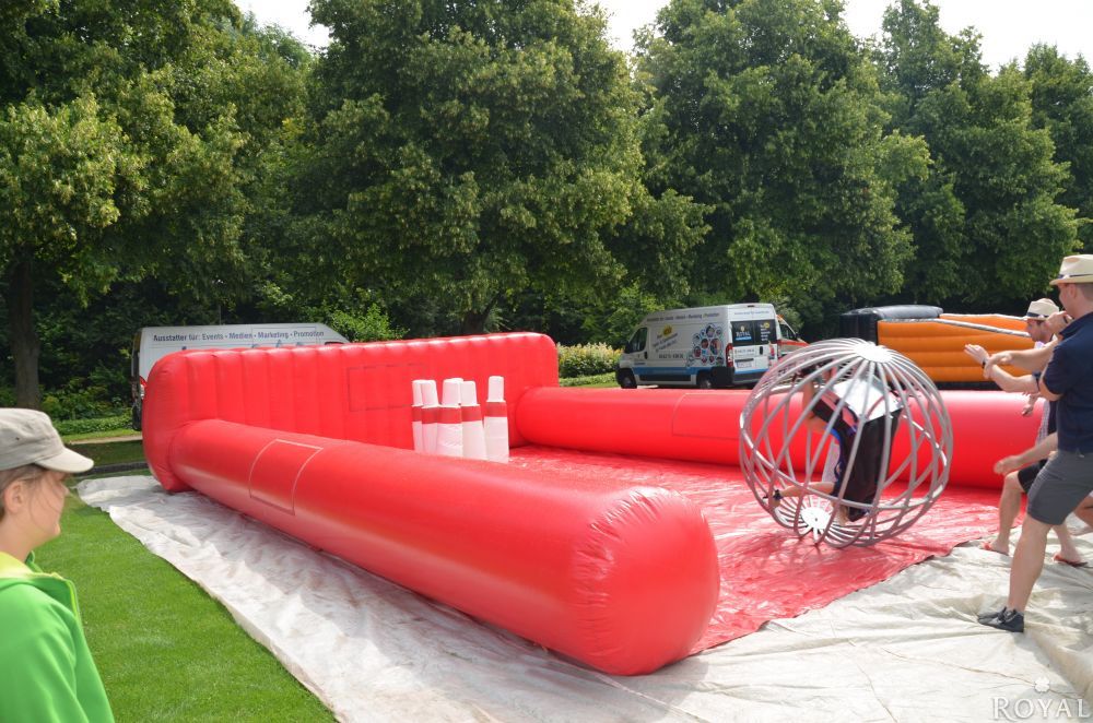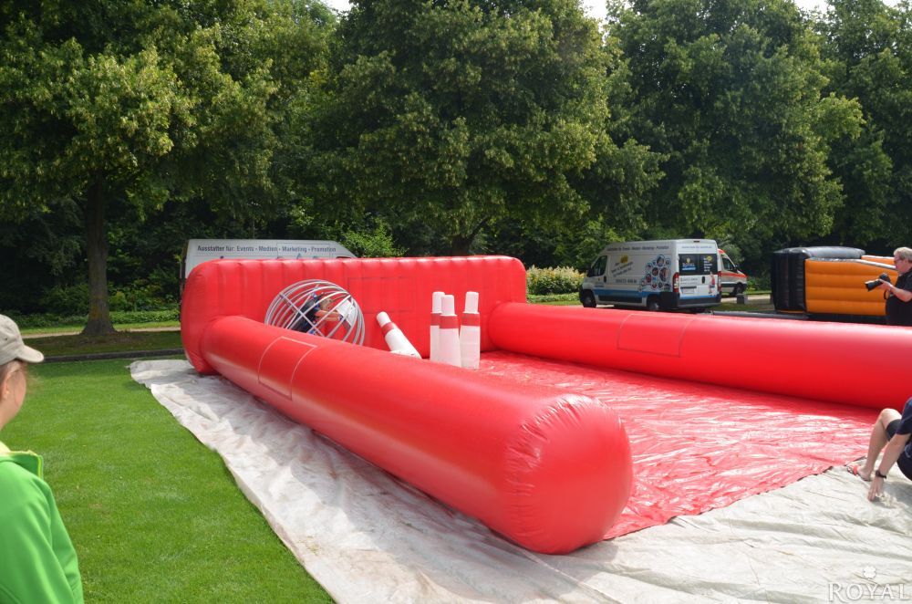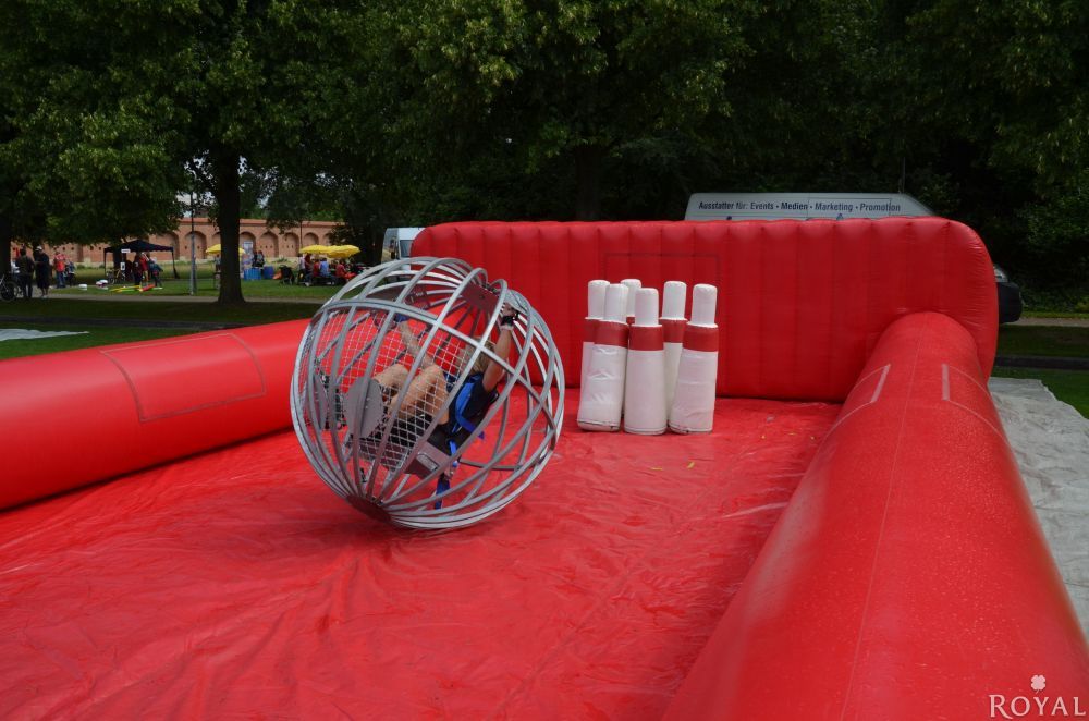 Actionreicher Kegelspaß, wobei sich die Kandidaten in der sicheren Metallkugel als lebende Bowlingkugel befinden. Dieser wird von unserem geschulten Personal festgezurrt und eingewiesen. Das Einzige was Sie hier noch benötigen ist Mut und den Spaß am Nervenkitzel. Durch Gewichtverlagerung kann man die Kugel steuern und im besten Fall alle "Neune" abräumen.