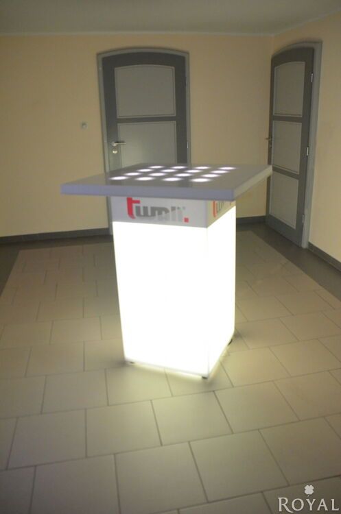 Wir gestalten die Tischoberfläche sowie die untere Werbesäule mit Ihrem Branding.