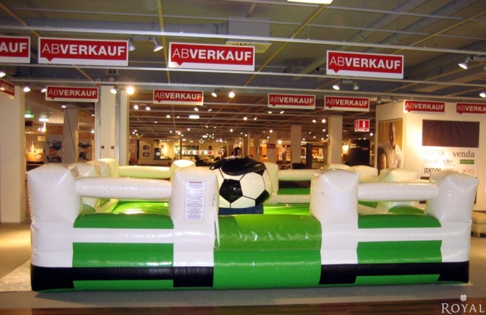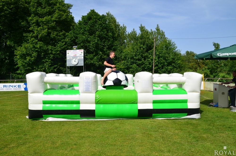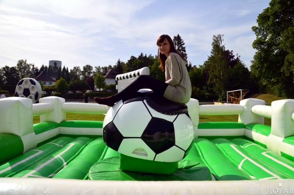 Bei unseren Fussball Rodeo erhalten Sie das Fallkissen in Form eines Spielfeldes und der professionelle Aufsatz ist ein riesiger Fussball.