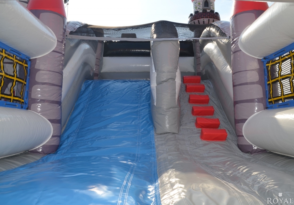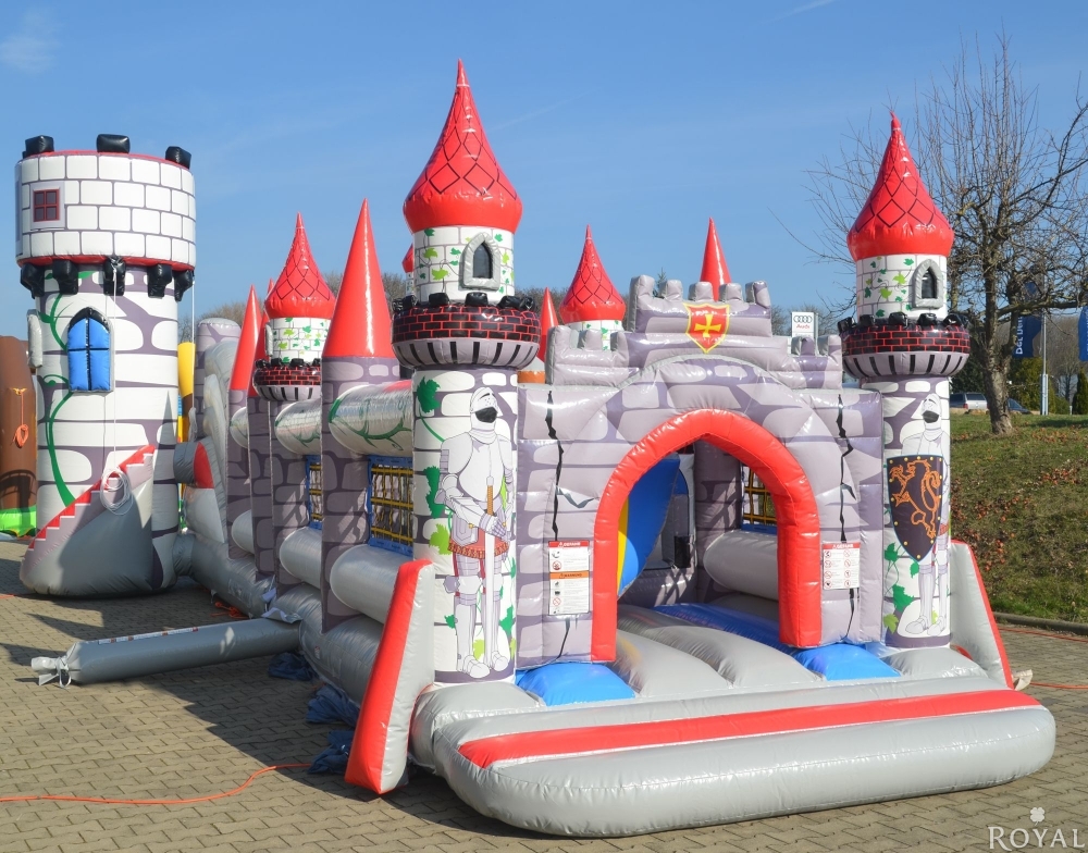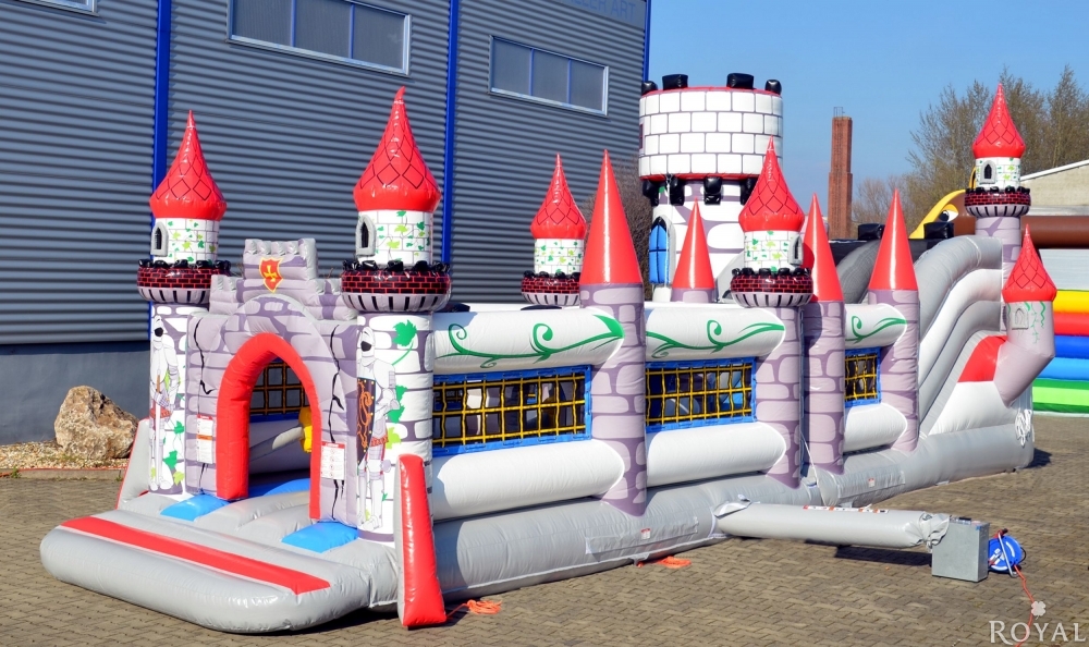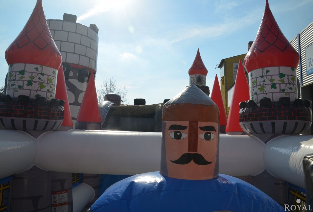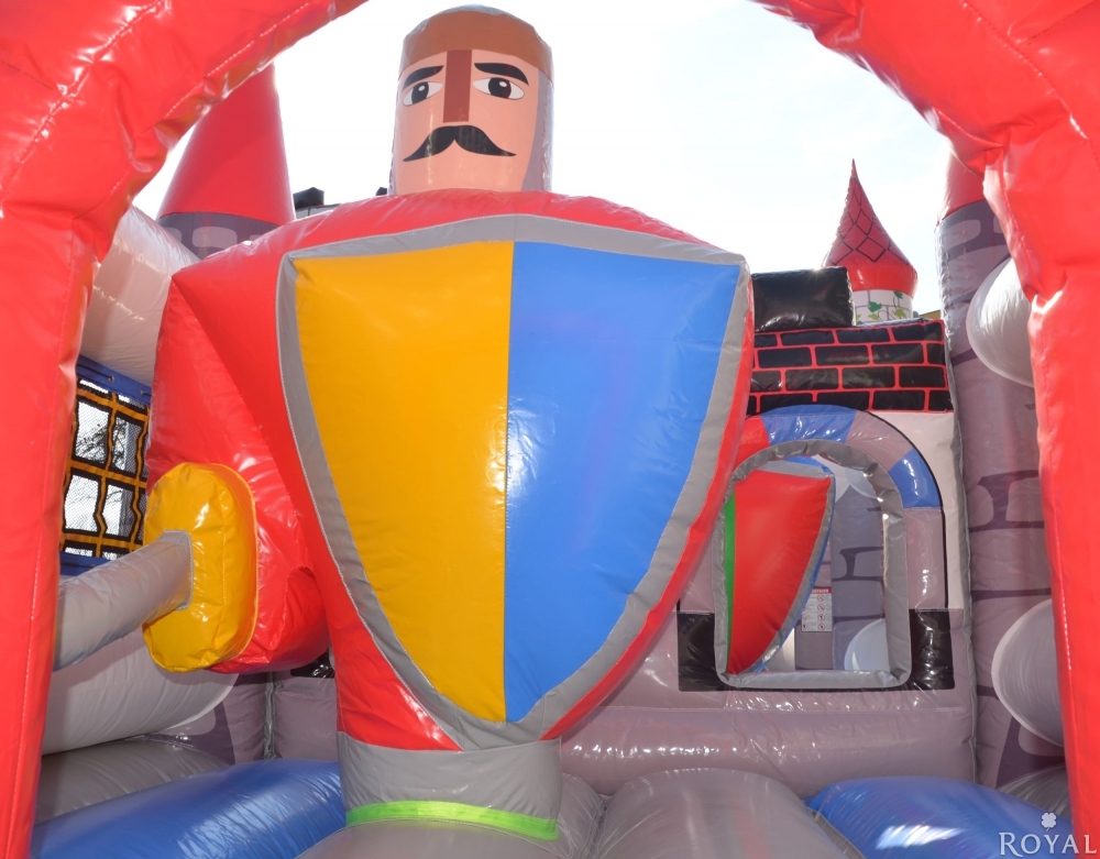 Aufblasbare Erlebsniswelt im Ritter Design aus einer Kombination von Rutsche & Hüpfburg mit verschiedenen Hindernissen für Spiel & Spaß.