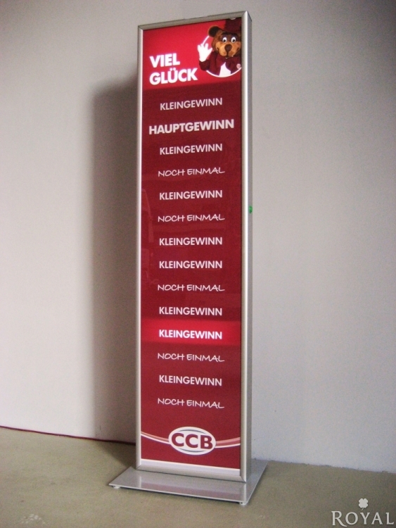 Unsere altbewährte Glückssäule habe wir mit neuen Features aufgefrischt und verfeinert. Das hochwertige elektronische Promotion-Spielgerät wird nun aus eloxierten Aluminium Profilen hergestellt und in der Elektronik sind schon im Standard mehrere Gewinnquoten voreingestellt. Diese kann man leicht per DIP-Schalter ändern. Somit bestimmen Sie, wie viele Klein- und auch Hauptpreise Sie auf Aktionstagen ausgeben. Statt Neonleuchen wurden leuchtstarke LEDs eingeabut. Damit Sie Ihre Werbebotschaft schnell tauschen können, verwenden wir dazu Klapprahmenprofile. Funktionsprinzip: Durch Drücken des Starttasters beginnt ein Durchlauf der 14 Lampenfelder. Im Ausrolleffekt leuchtet am Ende ein Feld auf. Es gibt integrierte Geräusche für Durchlauf und Gewinne. Branding: Die Leuchtfelder können individuell mit Ihrer Werbung, Slogans oder Sprüchen gestalten werden (gegen geringen Aufpreis). Wir beraten Sie dazu gern.