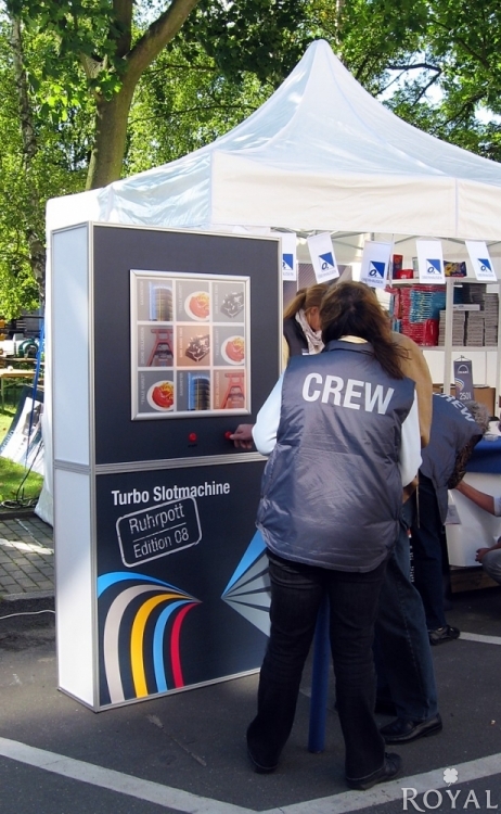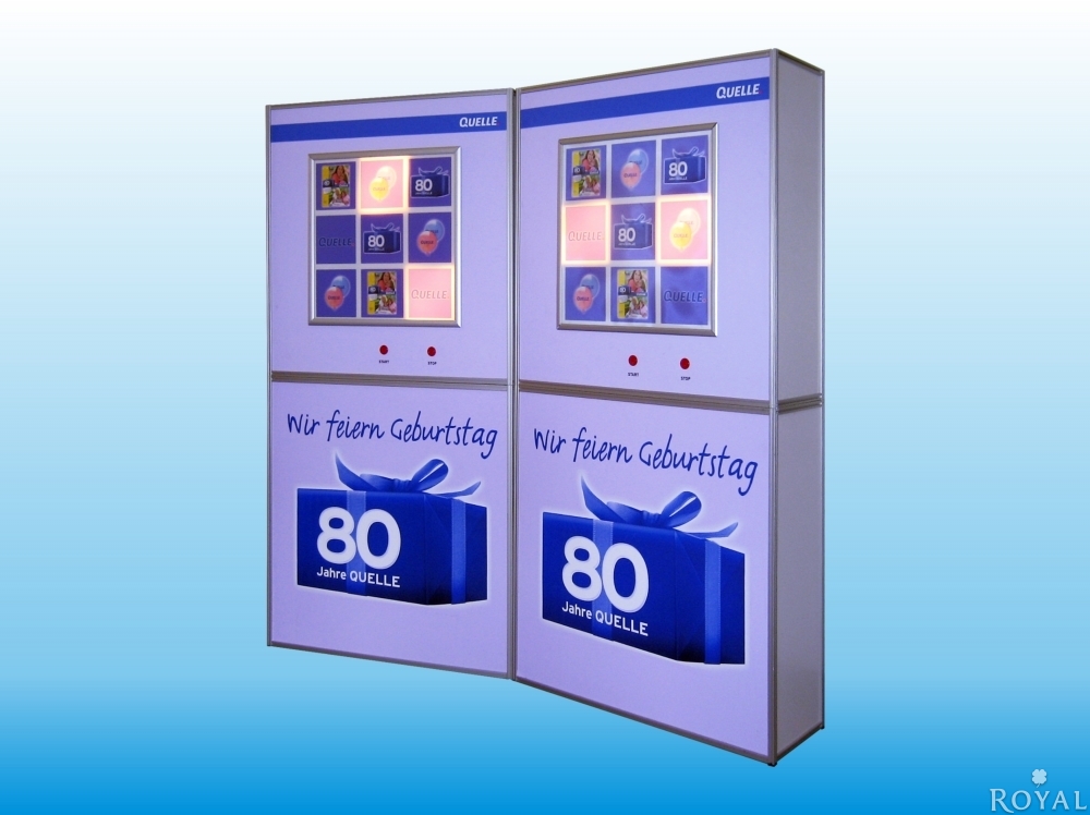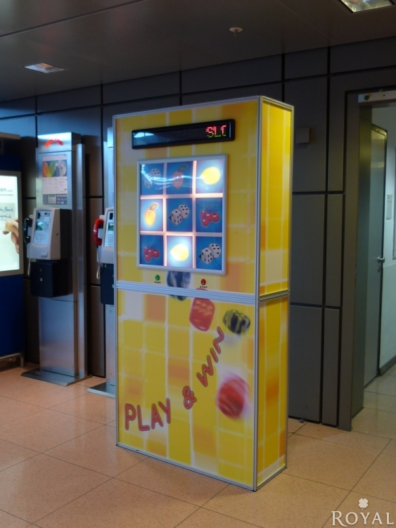 Sehr interessantes Werbe- und Promotionspiel ähnlich einen "Einarmigen Bandit" - 2 gleiche Symbole = 1 Gewinn. Das Glücksspiel funktioniert wie folgt: Durch Drücken auf den Start-Knopf beginnt ein Durchlauf alle Felder im Lauflichteffekt. Nach Drücken des Stopp-Knopf bleibt die erste "Walze/Leuchtfeld" stehen. Nach dem 2. Drücken stoppt die 2. "Walze/Leuchtfeld" usw. --- Leuchten zwei gleiche Symbole hat der Teilnehmer gewonnen.