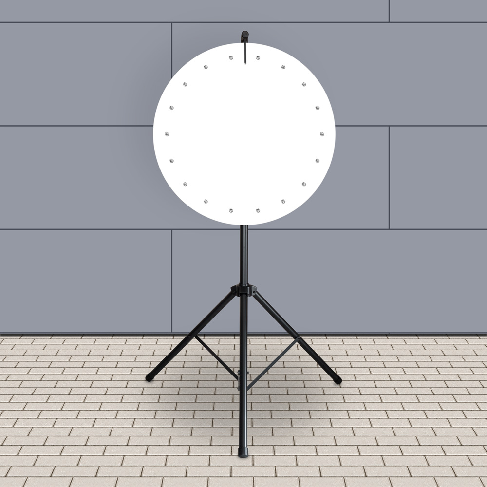Glücksradscheibe aus 10 mm Kunststoff, cnc-gefräst mit gefaster Kante, weiß. Brandschutzklasse B1 (schwerentflammbar) nach DIN 4102 (D). Das Glücksrad ist komfortabel in 2 Teile zerlegt und einfach innerhalb 1 Minute auf- bzw. abgebaut. Versteckte Befestigung der Glücksradscheibe – keine sichtbare Mittelschraube, keine Einschränkungen bei der Gestaltung. Zwei wartungsfreie Hochleistungslager sorgen für einen sauberen Lauf der Glücksradscheibe. Hochwertig gedrehte Edelstahlstopper - neutraler Farbton passt sich jedem Layout an (kein Korrodieren oder Abbrechen). 3-Bein-Standfuß aus Aluminium.